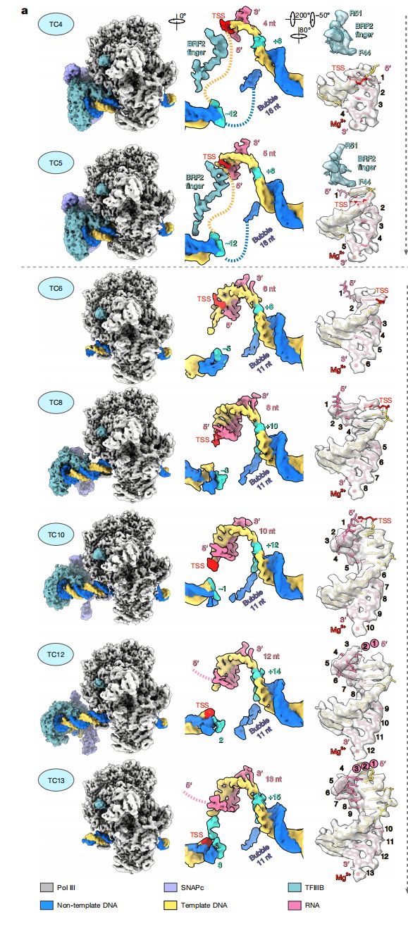 分析获得的七个高分辨率Pol III-TC结构(分别停顿于转录起始位点下游4至13位核苷酸)揭示:TC4和TC5属于起始状态(initially transcribing complex, ITC),而从TC6起Pol III进入延伸状态,说明Pol III由ITC向EC的转变发生于合成第6个核苷酸时(图2)。